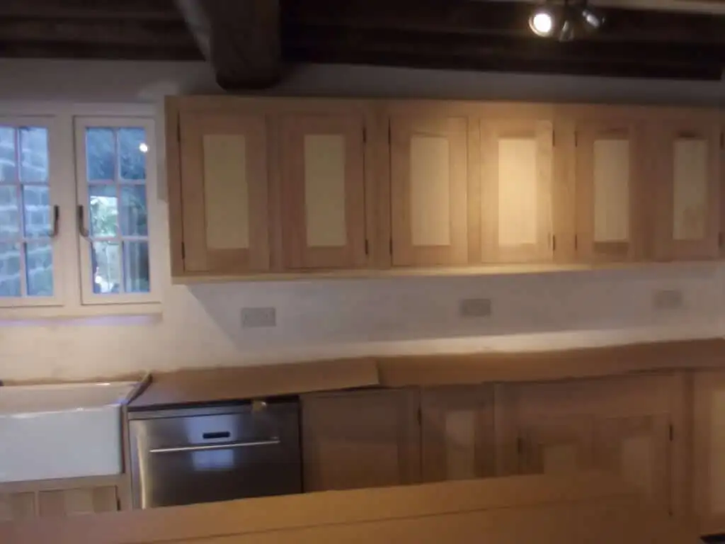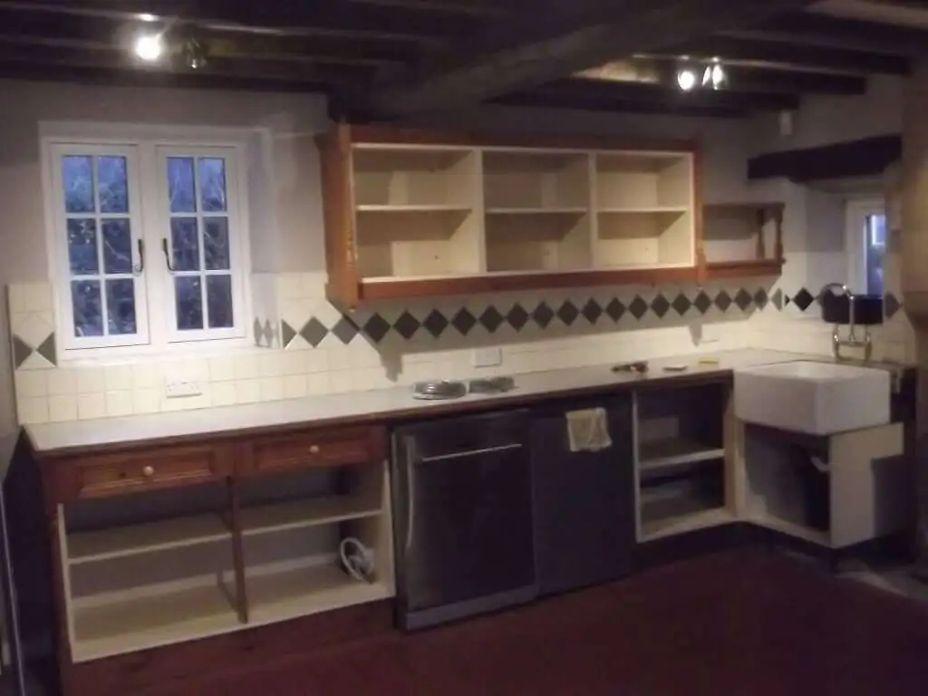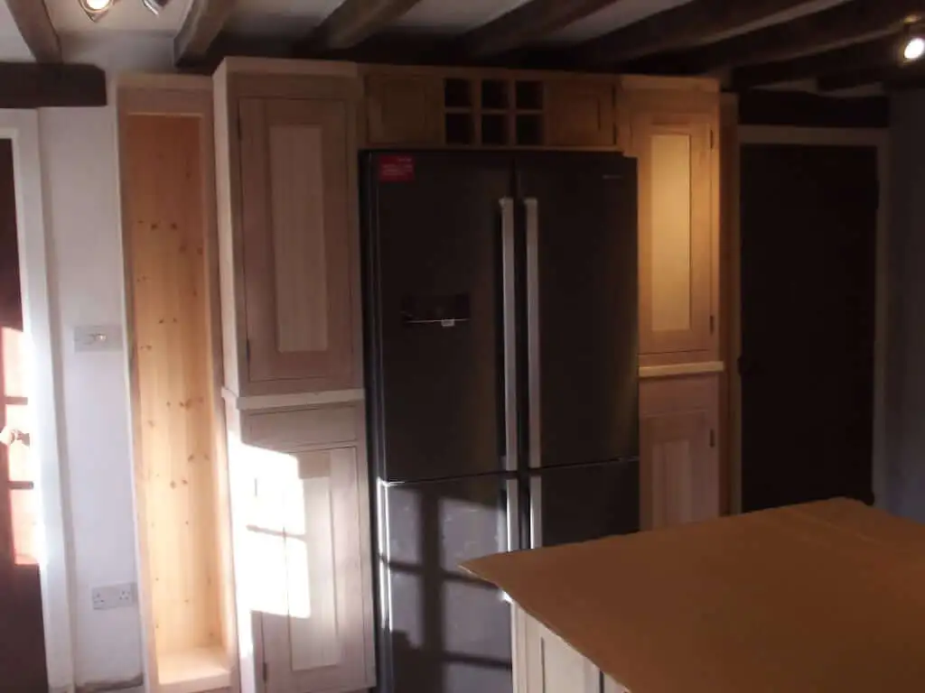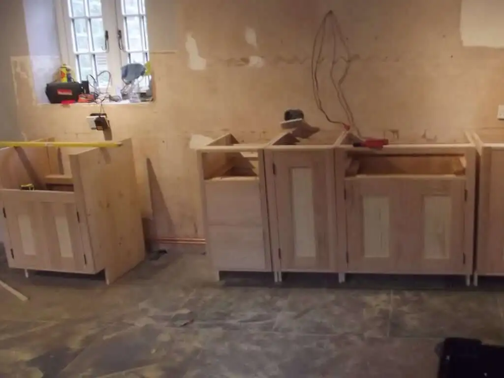 I was asked by Colin and Jane to have a look at what I could do for them in their renovated farmhouse kitchen. As expected in such an old building, none of the floors and walls were up to scratch and the floor itself was clearly not level. The floor was sloping towards the back door so I suggested using kick plinths instead of framed legs as you can't see the slope on the cabinets as much with a recessed kick plinth.