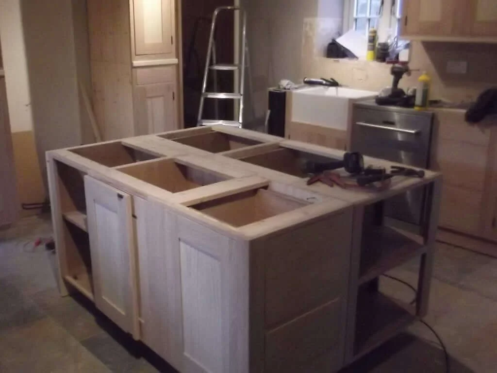 The island consists of a bookcase for Jane's cookbooks and plenty of deep drawers for pans and dishes. The drawers are all traditionally made using dovetail joints. The drawer boxes are from Redwood pine with solid oak fronts. The rest of the cabinets required included a Belfast sink housing, and other door and drawer cabinets.